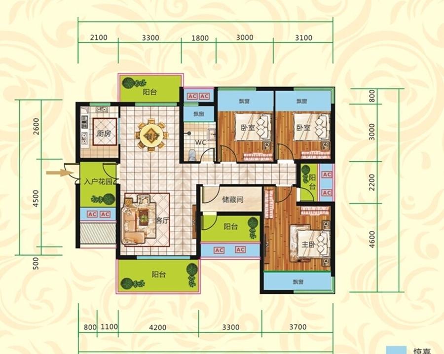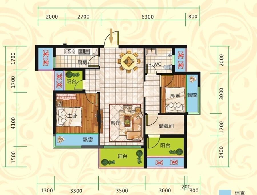 3室2厅1卫-A2户型 三房二厅 约106.82平米