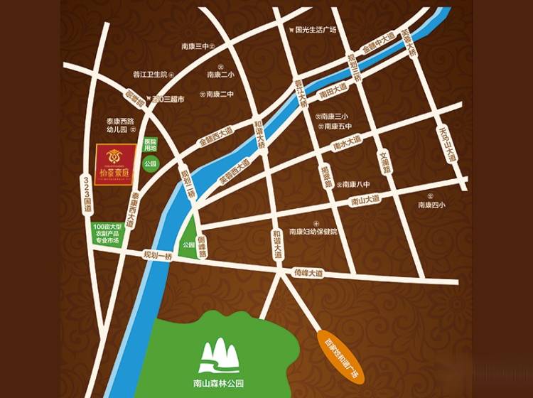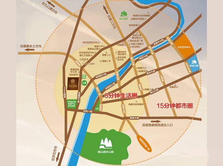 100亩农副产品专业市场、规划双公园、润和超市、泰康西路幼儿园、五〇三超市、蓉江卫生院、南康三中、南康二中、南康二小、农村信用社、赣州农商行、工商银行、农业银行、中国银行等 。 地下停车场、空中花园、一梯一户 。