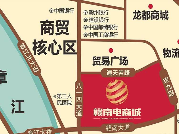 赣南电商城是由深圳宝鹰集团【股票代码002047】、天音控股【股票代码000829】和香港巨亿集团投资30亿元联手打造的老城超大型商业综合体,宝鹰集团成立于1994年,是全国建筑业具成长性100强企业,中国建筑装饰行业100强企业,全国建设工程鲁班奖获得者,天音控股成立于1996年,是深圳市企业综合实力14强,中国500强企业之一,香港巨亿集团业务涉及投资、国际贸易、珠宝首饰、电子商务、酒店旅游、房地产、能源矿业等领域,先后在莆田、苏州、山东、新疆等地投资开发房地产项目,公司连年被当地人民政府授予“守合同重信用”、“纳税大户”和”纳税先进单位“。 赣南电商城位于赣州老城区八一四大道和赣南大道两大城市主干道交会处,过桥即到章江新区,更有汽车站、火车站,快速出行。毗邻赣南贸易广场等众多成熟市场,是连接赣州四大商圈的重要枢纽,项目总占地面积约175亩,总建筑面积约45万平方米,为赣州市老城区超大型的商业综合体。主要规划有贸易品牌批发中心、九方购物中心、世界500强沃尔玛、星级酒店、翡翠公寓、和巨亿城住宅区等。九方、沃尔玛,以全新的商业格局,为老城区带来商业的无限繁荣和投资前景的光明,体验一种全新的生活。第二座九方购物中心落址于此,世界500强沃尔玛进驻,契合巨亿城住宅醇熟配套,满足家庭成长需求。