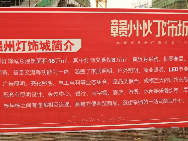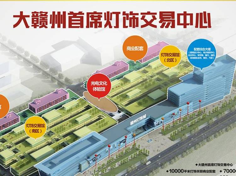 商汇广场R26;赣州灯饰城位于赣州市南康区,105国道、赣南大道、323国道交叉口,1上大广高速,2上厦蓉高速,3到南康家具大市场,紧临5000亩家具产业园,开车15就是赣州市章贡区、开发区及赣州黄金机场。京九铁路、规划建设中的昌吉赣高铁、城际高铁构建连接四省快速通道,物流网络可通达全国。 开发商赣州天盛置业以专业筑造精品商业地产的开发理念,定位批零结合经营模式,保证市场永续经营。项目总建筑面积18万㎡,是目前江西规模、品类全、超现代、专业化的一站式灯饰采购中心,集贸易采购、批零兼营、展览展示、电子商务中心及光电文化体验馆、照明设计中心等功能于一体。其中灯饰交易馆规划8万㎡,涵盖了家居照明、户外照明、商业照明、LED节能照明、广告照明、亮化照明、电工电料等。 赣州灯饰城还配备有酒店会议中心、汽车养护中心、银行、餐饮、休闲娱乐会所等综合商业配套。一个灯饰主题业态,多种业态组合,功能配套一应俱全。