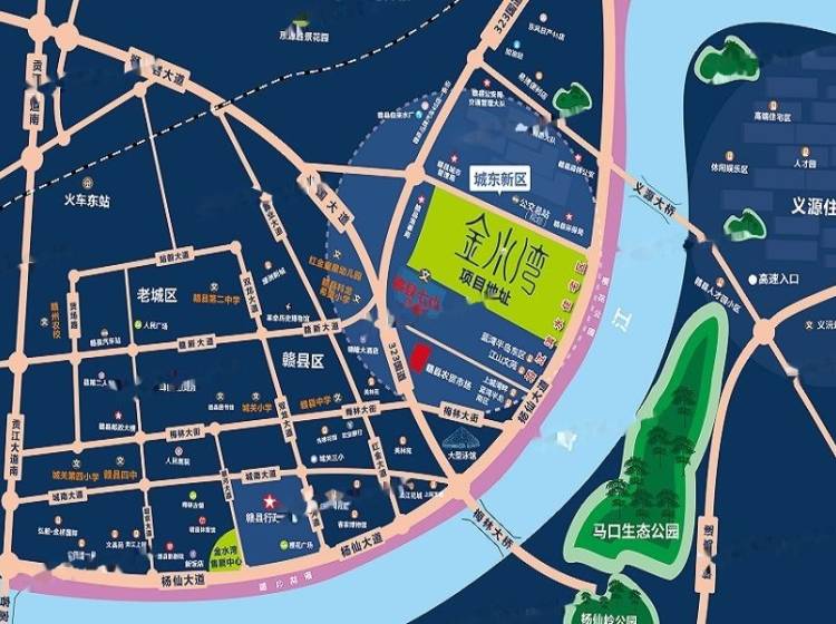 项目位于赣县区杨仙大道东段(消防大队旁),城东新区发展主轴线,临近赣新大道、323国道直通赣州中心城区。周边学校农贸市场公交站等生活配套一应俱全,坐拥一线江景,尽享城东新区美好生活,双公园美景临窗既享,与樱花公园自然守望。赣县好户型 品江湾美好生活!通透板楼更舒适,板式结构、一线江景、7.5米瞰江南北景观双阳台、宽阔楼间距、优质拓展空间,全通透明星户型!