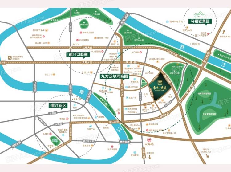 东方君庭位于赣南大道快速路与文明大道快速路交汇枢纽位置,出行便捷;周边配套成熟,1.5公里内有九方沃尔玛、万象国际广场、旺达天虹(在建)三大购物中心;500米内三大公园环绕(栎木坑公园(规划)、赣州动物园、五龙客家风情园)与栎木坑公园(规划)仅一路之隔;白云小学、章贡中学、赣州二中等一站式全龄段教育资源环绕。