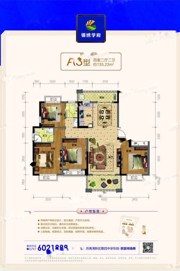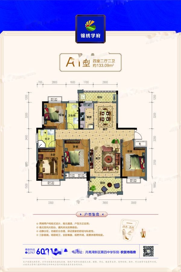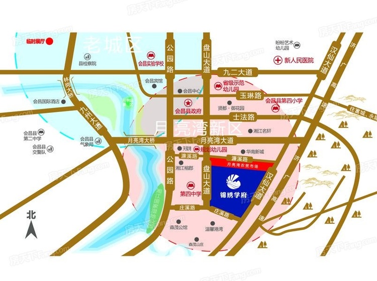 会昌锦绣学府项目是集住宅、商业为一体的高端生活花园运动小区。项目位于月亮湾新区稀缺地段核心区位,周边行政中心、文化中心、商业中心、居住中心、医疗、教育、市政绿化配套等应有尽有。以人性化、生态型,致力打造“地中海花园式”高尚社区的规划理念,超宽楼间距、超大空间,真正做到人车分流,运用时尚的设计元素融合地中海建筑文化艺术,借景与造景并用,塑造超大生态园林景观。 锦绣学府项目总占地面积约4万㎡,总建筑面积约10万㎡,未来规划入住464户。项目由7栋住宅和1栋现代化农贸市场组成共8栋建筑构成,采用南低北高、错落有致的建筑布局,坐北朝南,板式设计,方正通透,1:1超宽楼间距,让每户都能享受充足的采光。