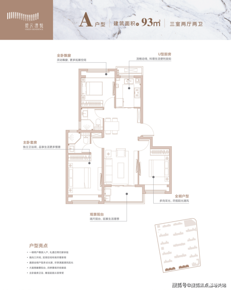 约93㎡户型做了两卫,套房主卧,居住空间相当舒适了。