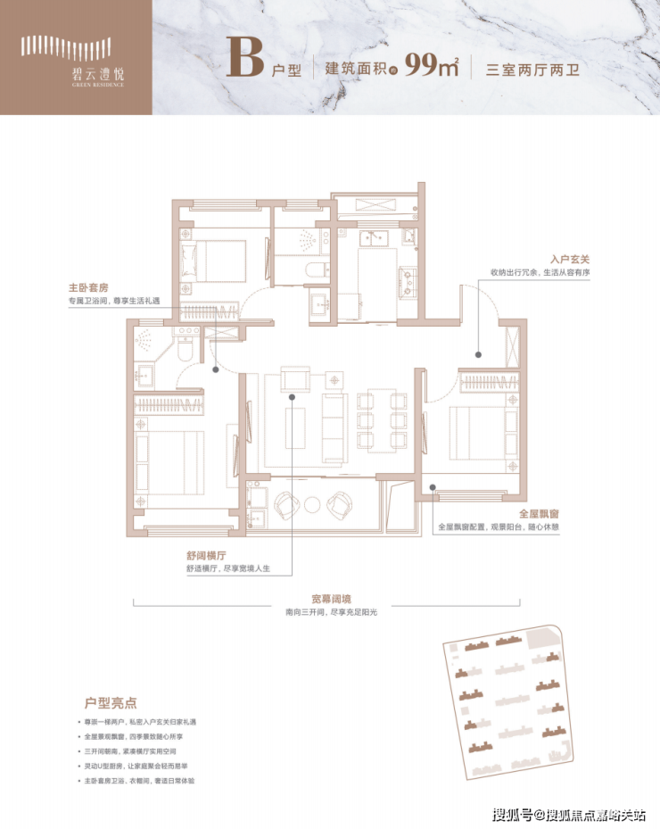 约99㎡户型“南向三开间+阔尺大横厅”,餐客一体+大阳台一字排开,纵深空间无限拉长,南向主卧室套房享受,可放双人大床&衣柜&床头柜,活动空间绰绰有余,主次卧分离,生活互不打扰,整体设计上几乎无浪费空间,备受青睐。