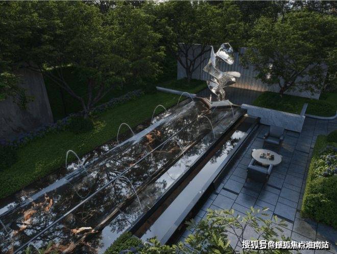 前场花园以兰特庄园为设计灵感,明确的中央轴线贯穿,中心喷泉顶端放置了应晶晶的山海金阙,以秩序中的自然理念通过几何布局、水景艺术和人文符号加功能美学与哲学融为一体。