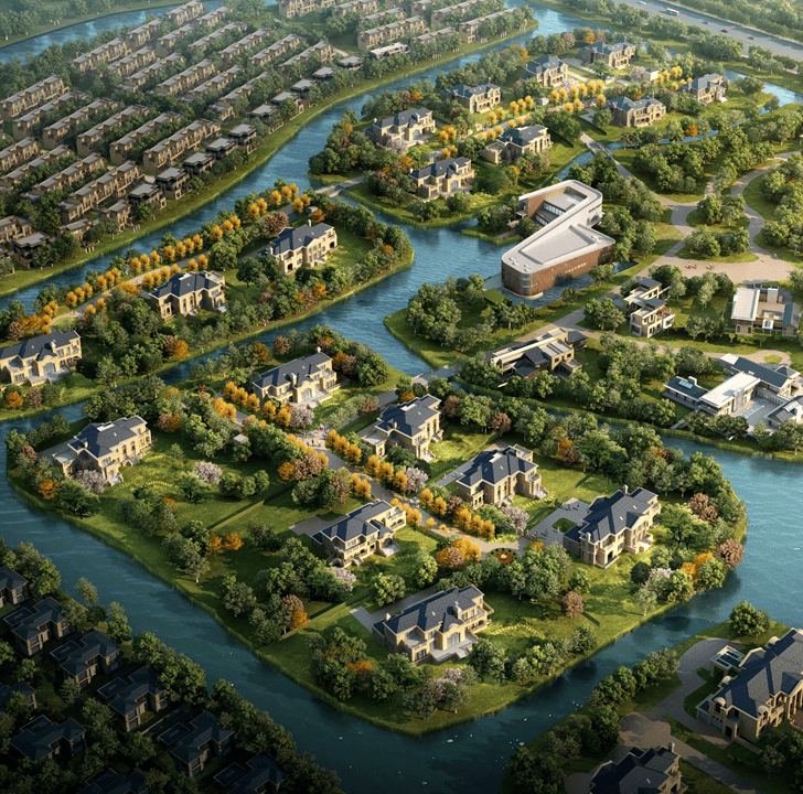 同时,河道纵横交错将海源别墅二期北分成三座小岛,形成岛居庄园式的独栋生活。