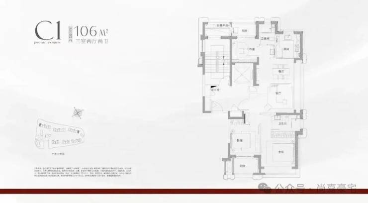 建面约106㎡三房两厅两卫(边套):三面采光,客厅270°采光窗搭配大面积飘窗,揽景入室;南北双阳台设计,兼顾功能与诗意;过道预留储物空间,细节之处尽显匠心。