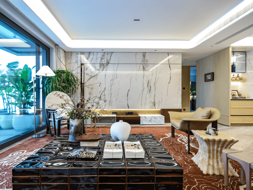 细节:全屋石材、岩板背景墙、弧形玻璃、隔音系统