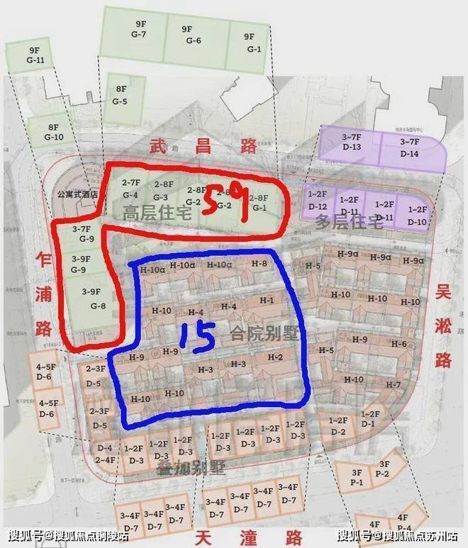 共125套住宅单元,从图示来看,全部是风貌住宅产品。以下为首开楼栋图示,59套小高层+15套合院别墅:
