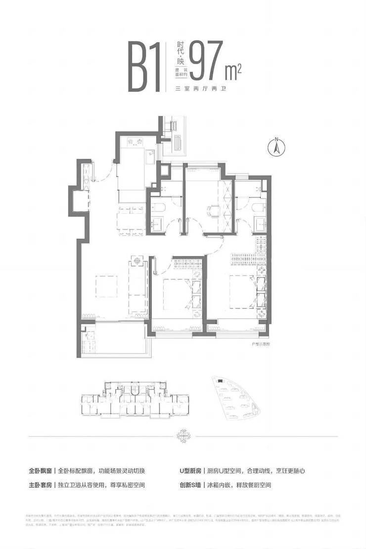 建面约97平的三房两厅两卫,在89户型基础上多了一个卫生间, 450-500万级别功能性更强。