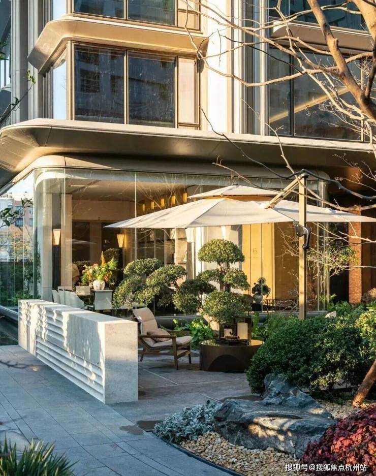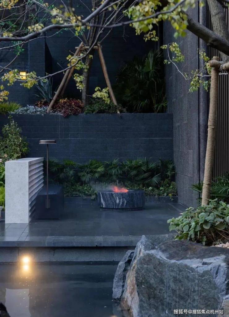 而在3、5号楼之间,则搭建了【围炉夜话】场景空间。古木纹奢石砌成的火炉旁,整木炭化石凳散发着山林野趣,一株红舞姬枫树翩然伴舞。冬日傍晚,好友围坐,体会名门温情。