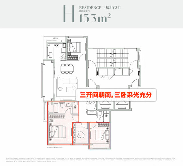 三开间朝南的格局延伸出三卧朝南的贴心设计,让阳光能充分洒满每一个居住空间。