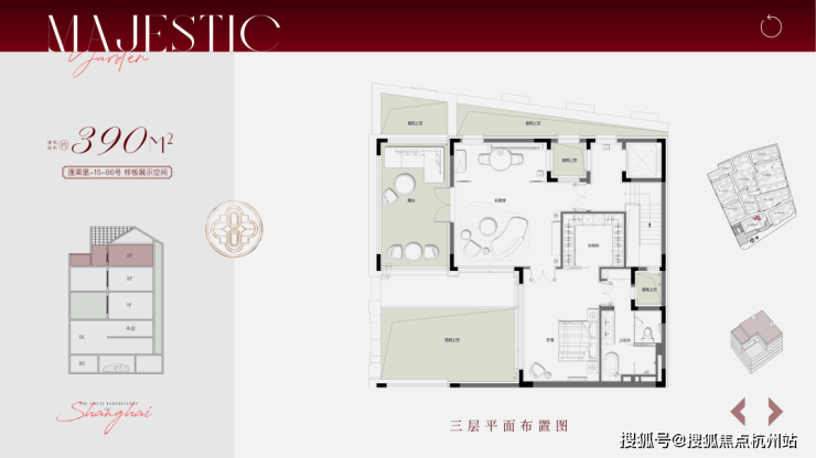 合院地上三层,面积段约210-500㎡,计合院82套。