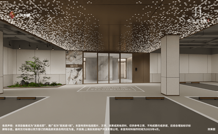 当多数地库还停留在满足基础功能性阶段,吴淞道1號已将车库升维成艺术归家剧场。相比传统车库窄车道与压抑管线外露设计,项目以约5.5米宽阔车道搭配格栅吊顶,利落线条消解逼仄感,行车视野更开阔,会车更轻松从容。