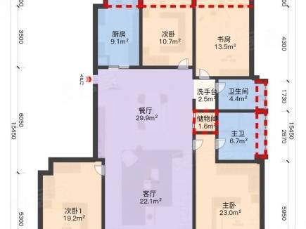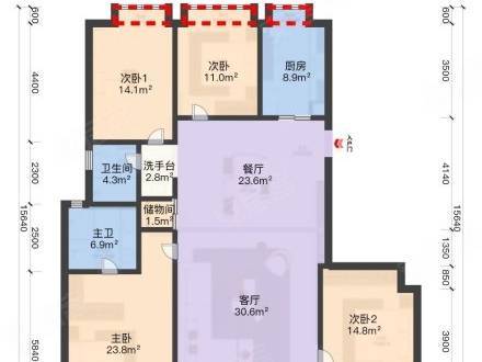亮点:4+1 房设计;约 80㎡奢阔客餐厅;双面采光边厅;双主卧套房;水吧台;使用率近 100%(含赠送)