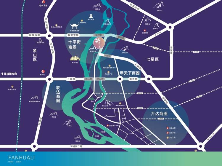 项目位于桂林市市区心脏位置,毗邻漓江歌剧院、漓江、解放桥,扼守城市主干道,畅达全城及周边县市,2Km范围内,四大中心环绕。