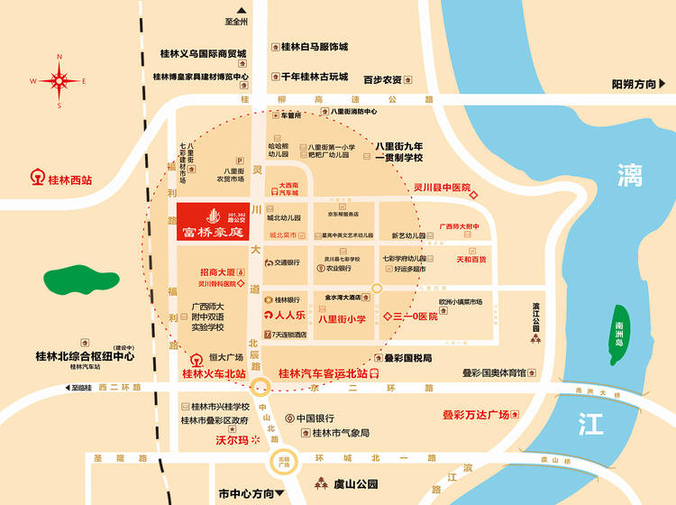 项目位于八里六路与灵川大道的交汇处,地处桂林市滨北城区位置-富桥综合商圈内,项目周围已构筑纵横交错密布的交通路网,高铁、高速、客运等四通八达的复合式、便捷的交通网络成就了项目便捷的交通出行方式。项目周围繁华环绕、配套齐全,叠彩万达、人人乐超市、千年桂林、大桂北菜市、灵川中医院、八里街学校为您生活保驾护航,毗邻公安巡逻警察大队,安全更无忧。