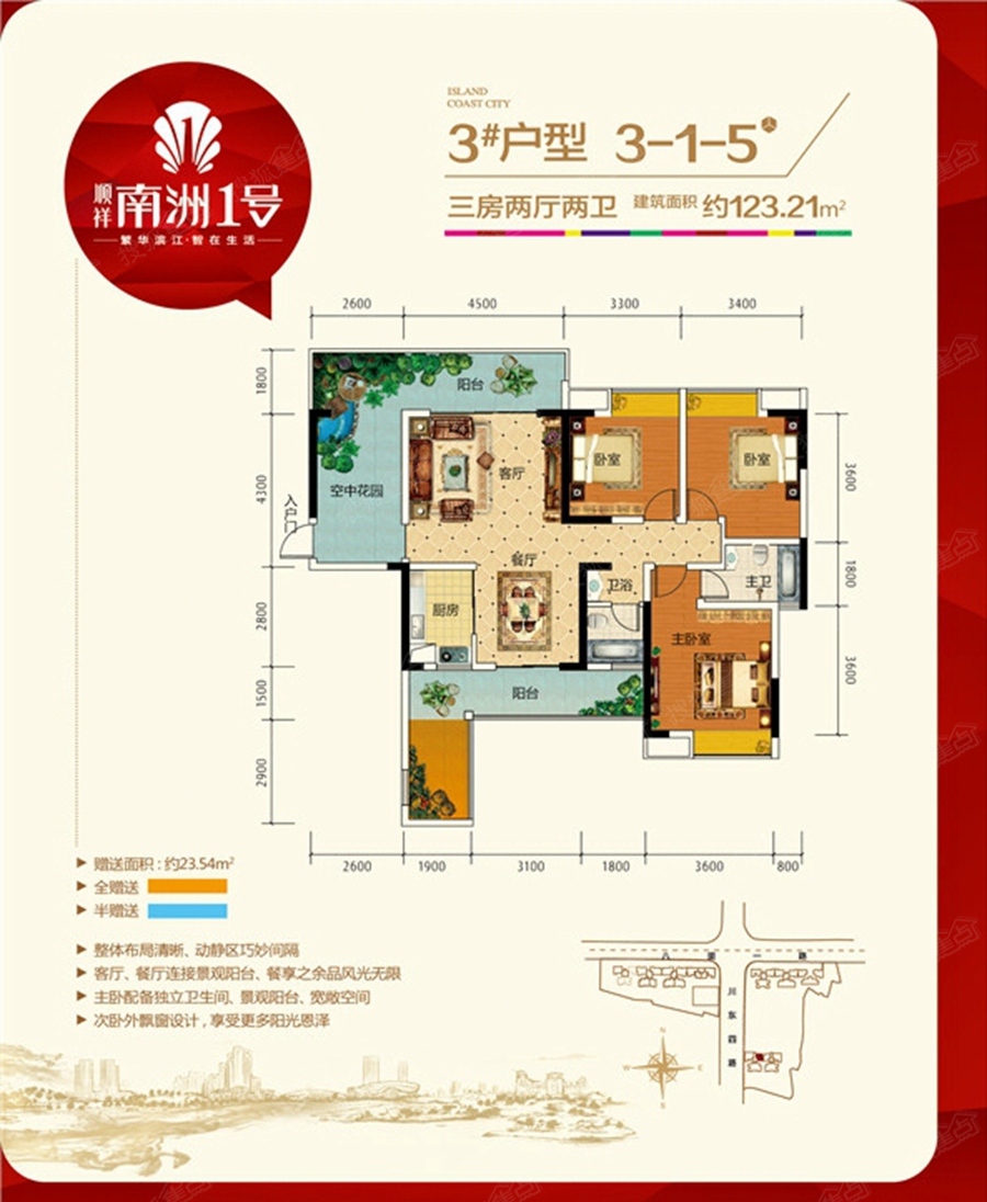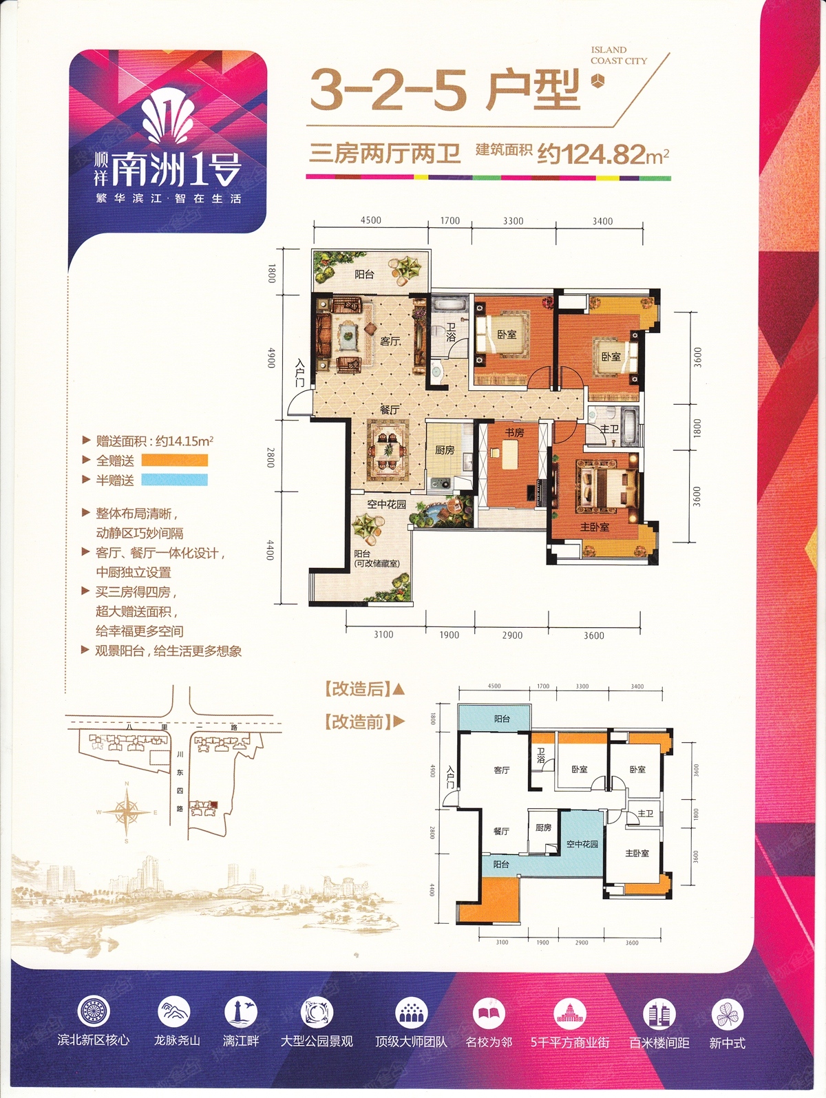 顺祥南洲1号项目占地约30亩,总建面约为11.5万平米,规划总户数859户,产品面积区间为61-145平米的1-4房,项目楼间距最窄处超过80米,最宽为120米;作为顺祥地产幸福系1号作品,面向的是城市中产阶级,项目分别由两获全国工程质量奖项的广西区三建施工,曾获得国际建筑空间设计金奖的香港飞龙图建筑设计公司担纲设计,曾打造南中国豪宅深圳星河湾的棕榈园林集团进行园林打造,国家一级资质物业公司进行物业管理。