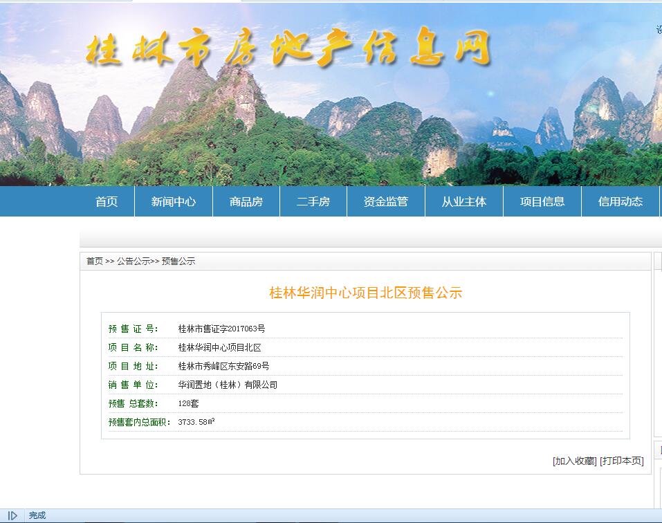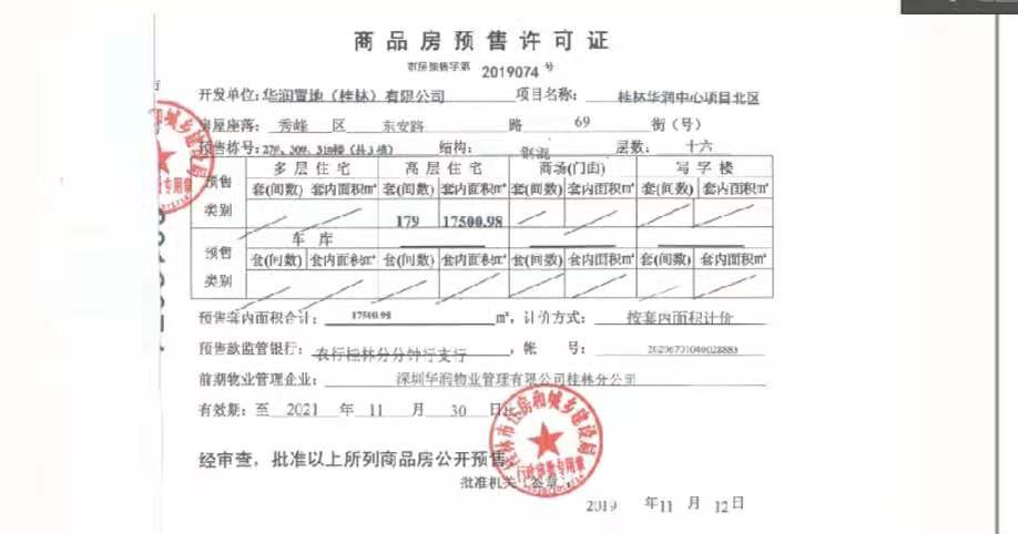 - 桂林市售证字2017063号 详情发证时间 2017-12-15绑定楼栋桂林华润中心项目北区128套房源证件照片