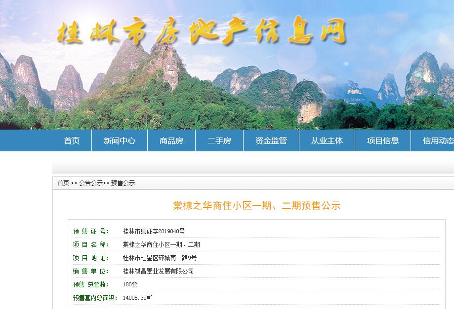 - 桂林市售证字2019040号 详情发证时间 2019-07-24绑定楼栋预售总套数:180套 预售套内总面积:14005.39㎡证件照片