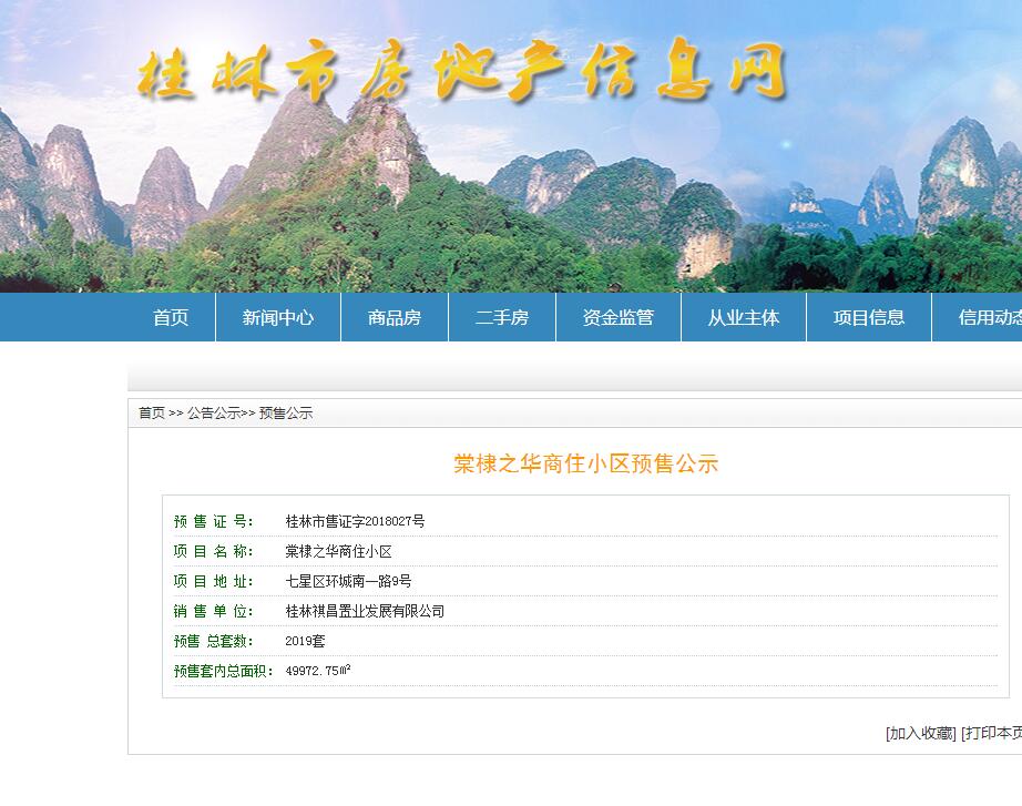 - 桂林市售证字2018027号 详情发证时间 2018-06-29绑定楼栋预售 总套数: 2019套 预售套内总面积: 49972.75㎡证件照片