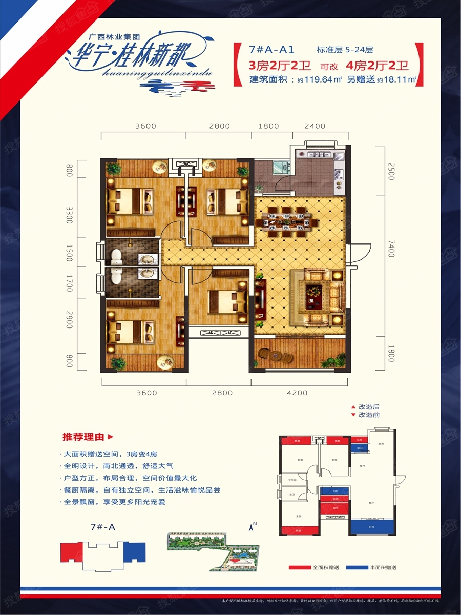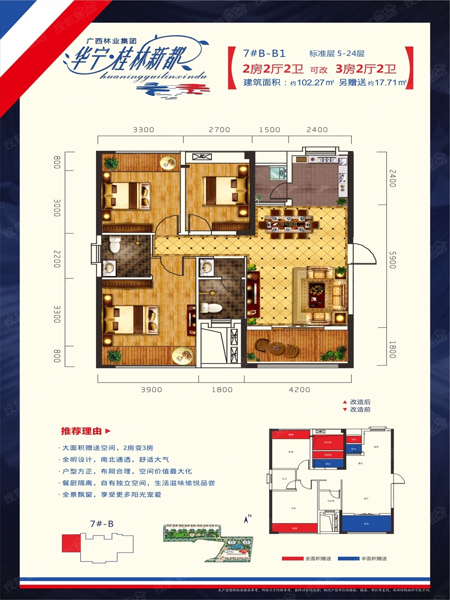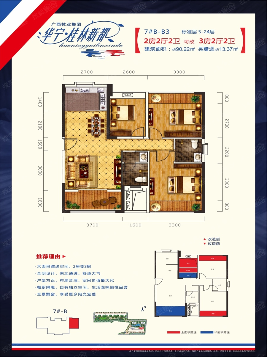 华宁桂林新都总建筑面积65亩,总户数约1049户,项目由自治区直属大型国有企业广西林业集团旗下子公司——广西华宁投资有限公司出资建设。项目规划建设6栋高层建筑和1.6万平米的集中商业和部分沿街商铺。小区楼体全部采用南北行列式布置,充分保证每户都有良好的通风采光以及景观。 华宁桂林新都采用纯正的法兰西风情建筑,并以法兰西风情园林为范本,规划打造有五大景观组团,分别:迎宾广场、嬉水广场、童趣乐园、亲邻空间及草坪运动休闲园,同时小区里面还有阳光泳池、篮球场、健身设施等丰富业主茶余饭后生活的配套设施。小区采用人车分流设计,避免流了人车混行的安全隐患。 户型产品方面,一期为83㎡~90㎡的2+1户型和102㎡~120㎡的3+1户型,均为明厨、明卫、明卧、明厅、明走道设计,同时,每个户型都配有双卫双阳台,给业主以良好的居住体验!