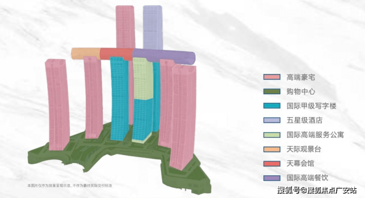 三大功能分区:天际观景台,天幕会馆,高端餐饮区(会籍制,仅供业主和会员使用)