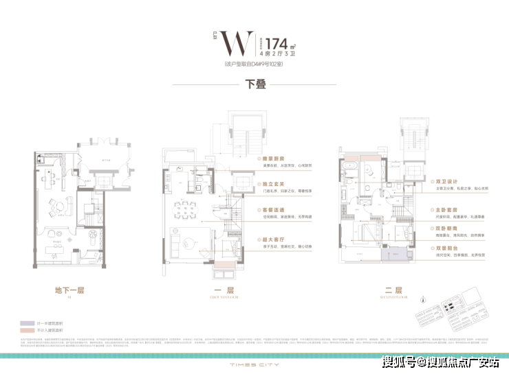 以建面约142㎡下叠为例,地上两层、地下一层阔绰空间,动静科学布局,全面考量三代同堂与二胎家庭的居住空间需求,以人性化质感空间演绎舒奢生活。