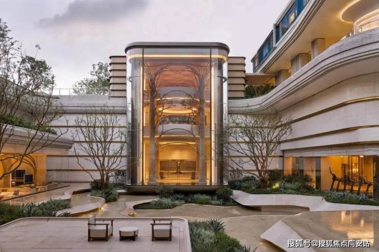 因项目整体抬高,从下沉庭院到架空层“空中花园”的落差极大,形成独特的峡谷地貌,杭序府的设计团队汲取九溪烟树为造园灵感,打造一个立体多维的城市溪谷交互园林;因项目毗邻江岸,杭序府的外立面以“站立的江潮”为灵感,