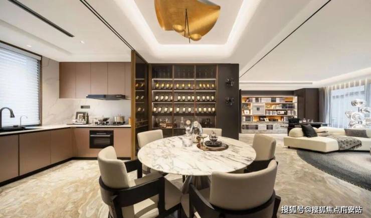 陶砚176㎡户型:取陶砚之自然璞实感,雕琢白冰玉的背景墙,客厅吊顶还原砚台造型,室内饰以瘦金体笔划装饰线条。