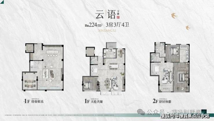 户型面积:平层185㎡,上叠208㎡,下叠224㎡