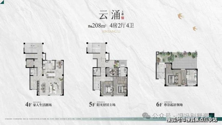 ·建筑面积约为208.45㎡4房2厅4卫的户型,上叠分为三层,地上四层、地上五层、地上六层(附带不上人屋面的大露台)。