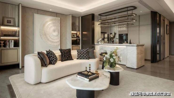 客厅背景墙的“烟雨江南”天然大理石,不同于传统平面背景墙,通过弧度及立体的造型处理,并镶嵌不锈钢材质,对于金茂而言,比奢石昂贵的,是让奢石真正与空间气场融为一体。