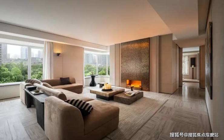 客厅视野开阔,地面选用银河白奢石,并配以“云杉”东方禅意幽香,由稀有天然中式香料提取,带来悠远宁静的五感意境,由闻献为亭舍定制调配“当生活变得过分随性时,很容易丢失了对仪式感的关注。”