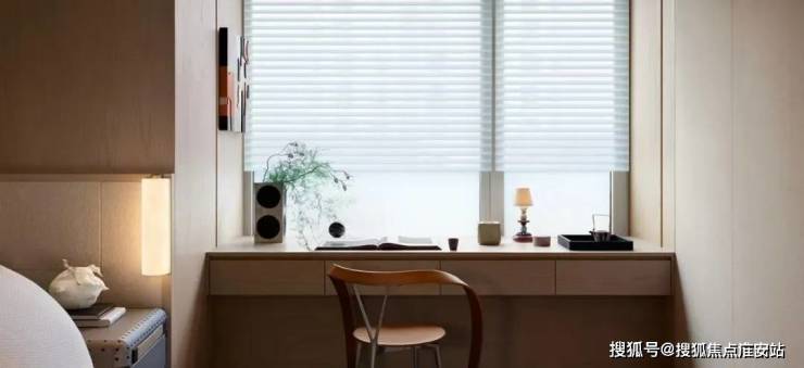 主卧、卫生间、衣帽间、书房通过廊道的关联被依次串联起来,让套房在功能上构成了简洁且有效的动线组合。主卧区域的采光极佳,窗外一片青翠,飘窗的场景化设计变成了这个空间的重点所在。在飘窗的内向包裹之下,150mm 高度的地台增强了飘窗的区域界定。主卧及书房立面的局部点缀了镜面材质,对空间起到了一定的延展作用。在特定区域的镜面反射之中,突出了艺术品在空间里的存在感,强化了空间与器物之间的紧密联系。