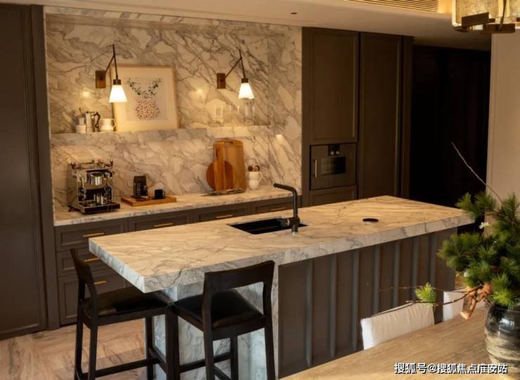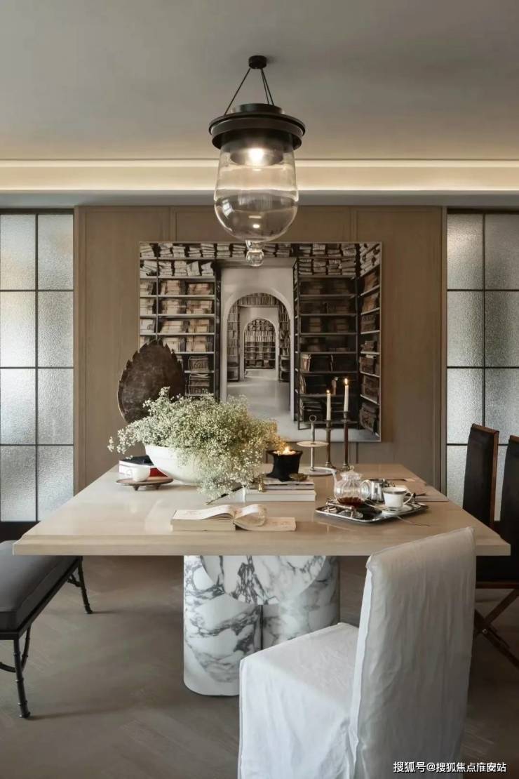 仪式感体现在对于材质和细节的精准把握和打磨之上,客餐厅选用天然大理石希腊木纹,通过纵横纹理拼接,让空间呈现精致而非繁复的优雅与奢华。沙发区域的壁炉设计,把对风格的需求转换为对观念和文化的获取。