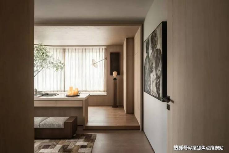 入户瞬间,心绪就静了下来,被宁和包裹。明亮的自然光透过远处超长百叶飘窗,充盈着室内。眼前,一座轻盈茶室如漂浮小岛,打破以往的格局经验,巧妙嵌入锁定视觉。半通透的屏风巧妙打散光线,若隐若现的朦胧之中,温润氛围弥散而开。