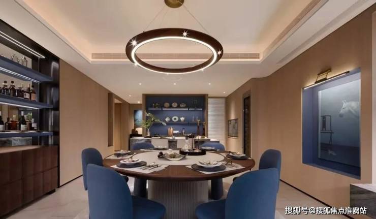 餐桌吊灯为琚宾团队设计的原创灯具;圆桌内置有内嵌式电动转盘,将生活的当代性隐入日常的使用中。