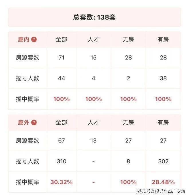 138套房源吸引了组家庭登记,其中人才4组,廊外有房家庭中签率最低,仅28.48%。