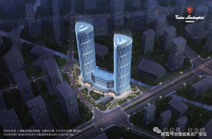 【建筑规划】:T1、T2为250米双塔楼(60层,T1写字楼、T2杭州托尼洛·兰博基尼行政公寓)、T3裙楼(12层,杭州托尼洛·兰博基尼酒店)