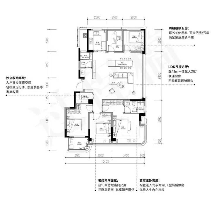建面约105㎡南厅户型,3房2厅2卫,含赠送得房率约93%。