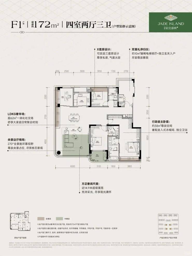 建面约172㎡F1户型,4房2厅3卫,含赠送得房率约96%。