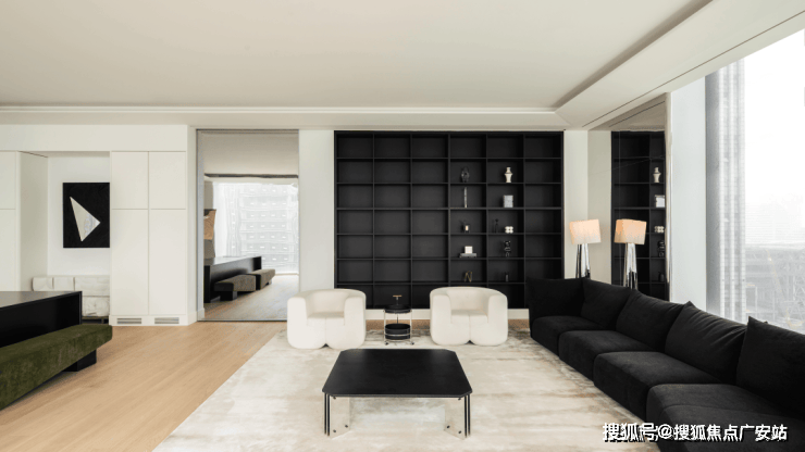 从材质方面,空间装饰十分丰富,留白和黑色的典雅作为核心,加入不同的金属、皮革和布艺,空间更加圆满,生活也随之更包容。