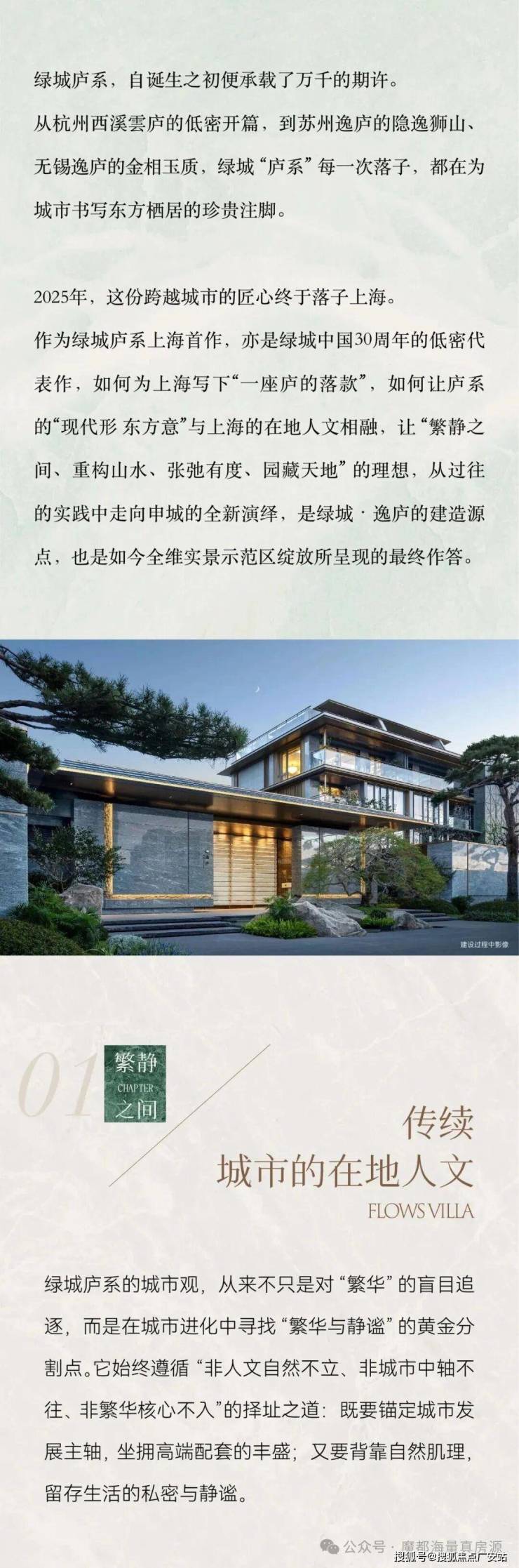 25年来,绿城总是将更好的品牌献予上海,从曾经的玫瑰园、黄浦湾、玉兰花园、锦绣兰庭等,到如今的申江三部曲、繁花三章,25年间经典与摩登,焕新与传承,一部部精湛作品凝结成给城市最好的答案。2025年,绿城更是带着「庐系」首入申城,以“现代形东方意”的美学笔触,将“天地为庐”的精神内核转化为可触摸的生活场景,且填补了张江低密社区的市场空白。