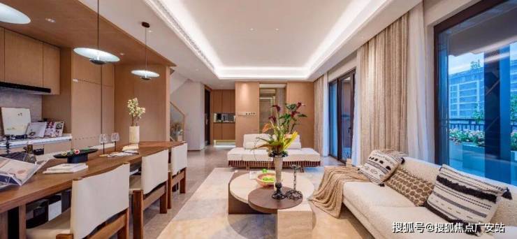 极简的线条强调出空间的自然与纯粹,巨幅落地玻璃将室内外的景致互相交融,作为业主专享的休憩与社交空间,可一边欣赏中央水院美景,一边与至交好友对坐倾谈,别有一番韵味。