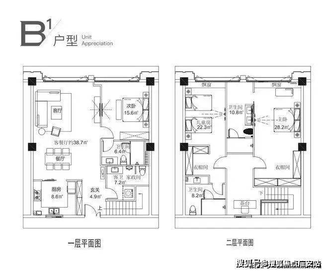 B户型:客餐厅一体,主卧带书房,中西厨,大衣帽间