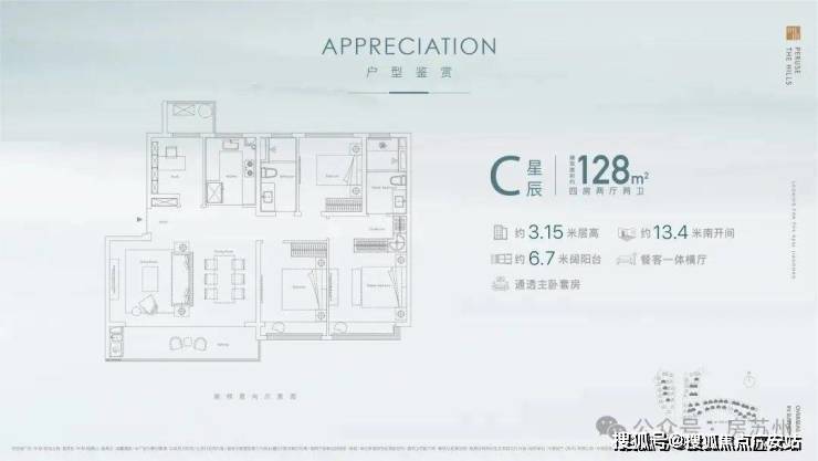 2.四开间朝南的设计,南向面宽约13.4米,整个户型方正气派