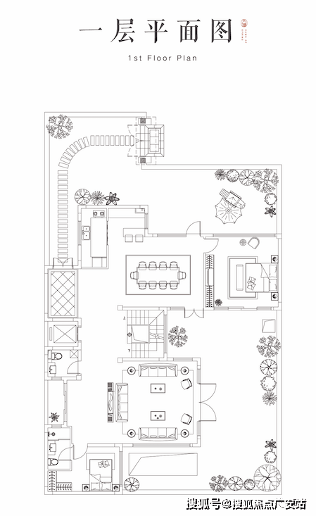 地面两层、地下一层的设计,空间阔朗感强。一层前后院子有160㎡+,相当于一个都市大平层的面积了。一楼大横厅、中西厨、老人房全都有,尺度真心亮眼。
