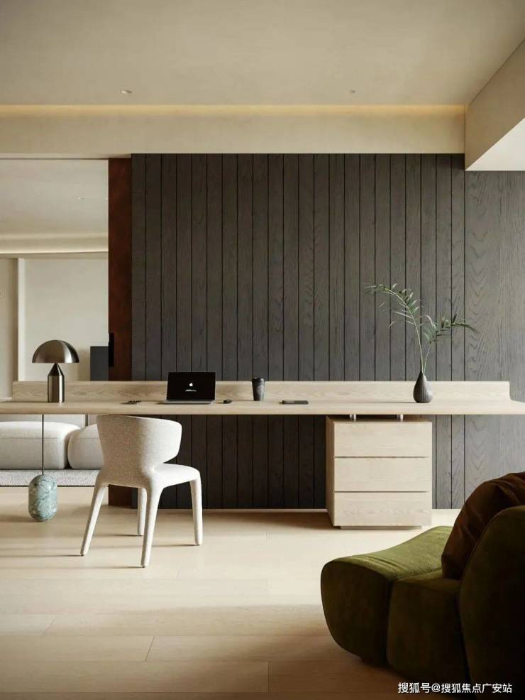 口袋移门代替了隔墙,拓宽了空间尺度,赋予书房未来独立成卧的灵活可能。温润的木质书桌搭配黑色木饰面,增添了空间层次感。